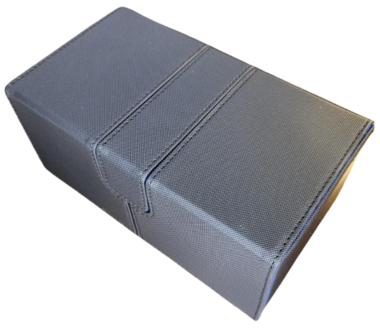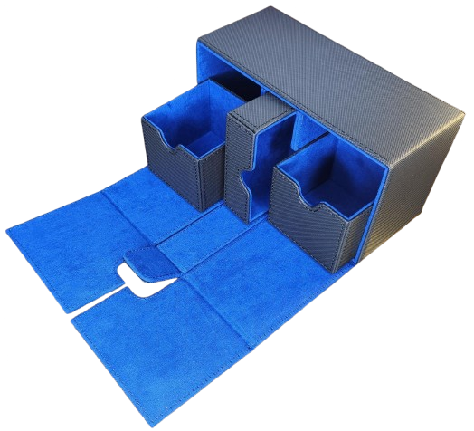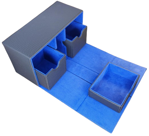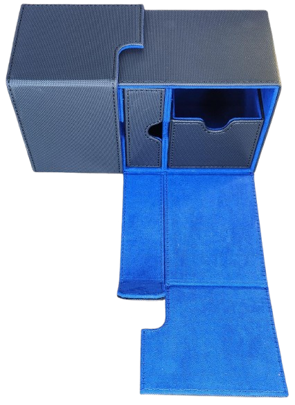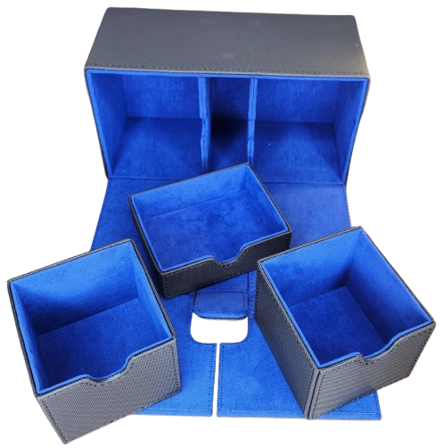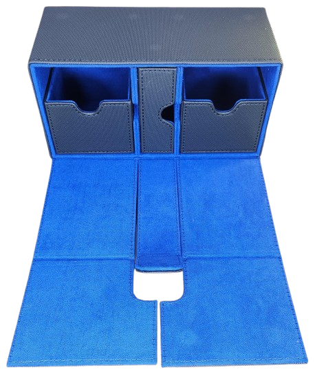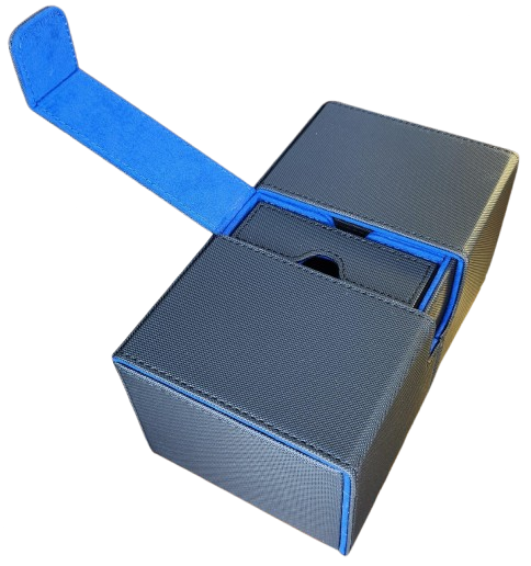 Keep your decks safe and stylish. This large premium black PU leather deck box with blue suede interior holds over 200 sleeved cards across two sliding trays, plus a dedicated middle tray for dice and counters. Strong magnetic closure keeps everything secure on the go.