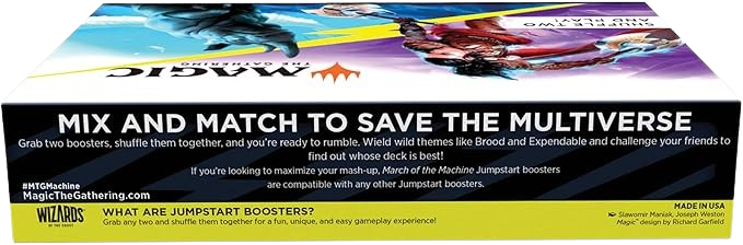 The March of the Machine Jumpstart Booster Box delivers instant Magic fun—just grab two packs, shuffle them together, and you’re ready to play. Each Jumpstart booster contains a themed mini-deck built around mechanics and creatures from March of the Machine, offering fresh gameplay combinations every time. Great for new players who want a fast way to dive into Magic, and equally fun for veterans who enjoy variety without the need for full deckbuilding. A full booster box provides hours of quick-play excitement, collectible cards, and endless replayability—perfect for casual nights, teaching new players, or adding spice to your collection.