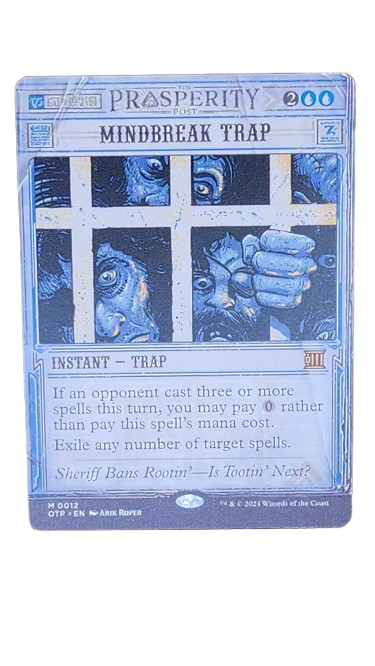 This Mindbreak Trap Breaking News (Showcase) printing from the 2024 set Outlaws of Thunder Junction gives a powerful counterspell an unforgettable new look. The alternate art and bold newspaper-inspired frame make it stand out in any deck or collection, while retaining the card’s iconic ability to exile spells from the stack. A favorite in Commander and eternal formats, Mindbreak Trap shines against storm strategies and spell-heavy decks, offering unique interaction when it matters most. Whether you’re sleeving it up for competitive play or showcasing it in your binder, this edition combines utility with one of the most distinctive treatments Magic has ever printed.